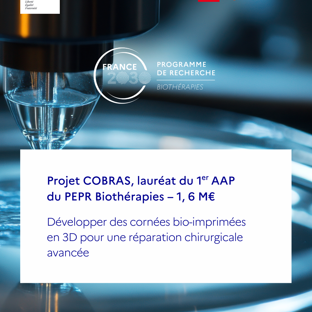 • Projet COBRAS (1,6 M€) : Développement de cornées bio-imprimées en 3D destinées à une réparation chirurgicale avancée, afin d’améliorer le traitement des lésions cornéennes sévères.
