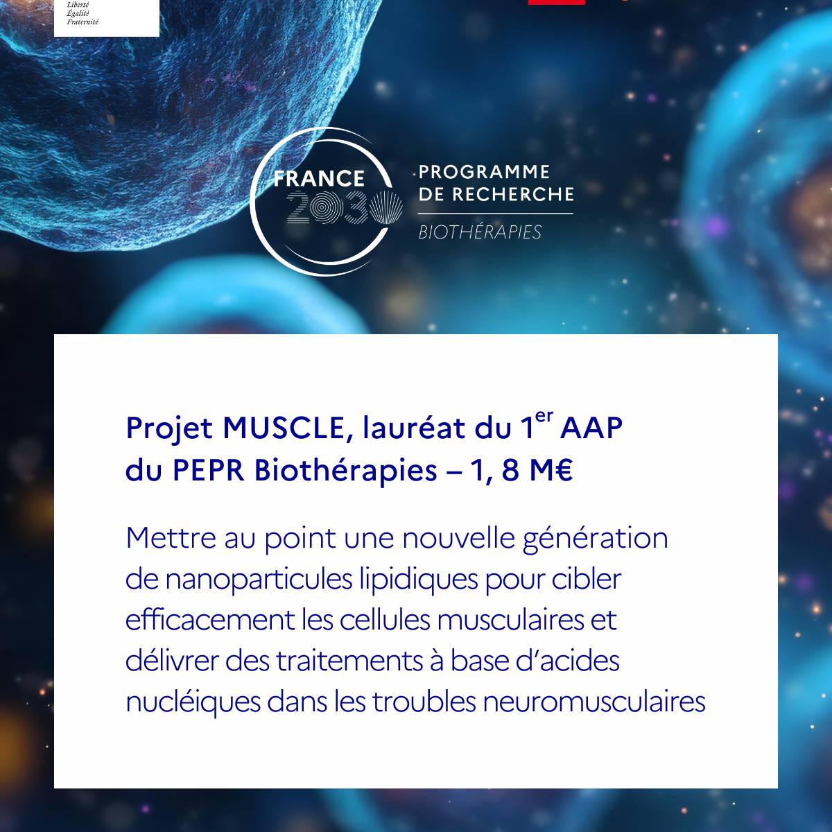 • Projet MUSCLE (1,8 M€) : Mise au point d’une nouvelle génération de nanoparticules lipidiques ciblant spécifiquement les cellules musculaires pour délivrer des traitements à base d’acides nucléiques dans les pathologies neuromusculaires.