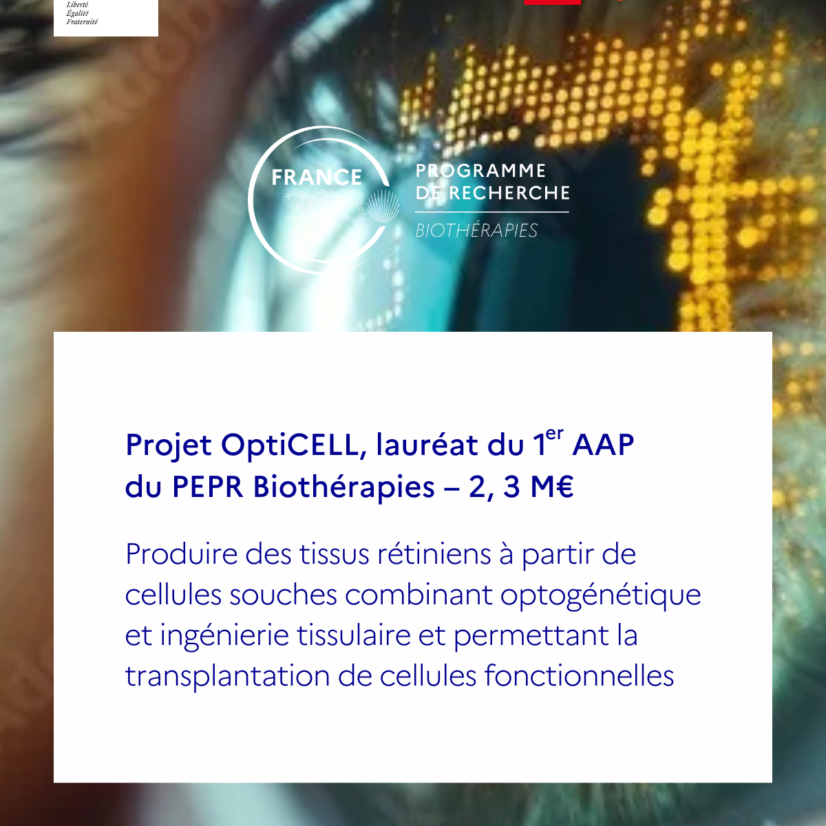 • Projet OptiCELL (2,3 M€) : Production de tissus rétiniens issus de cellules souches combinant optogénétique et ingénierie tissulaire, permettant la transplantation de cellules rétiniennes fonctionnelles pour des traitements innovants en ophtalmologie.