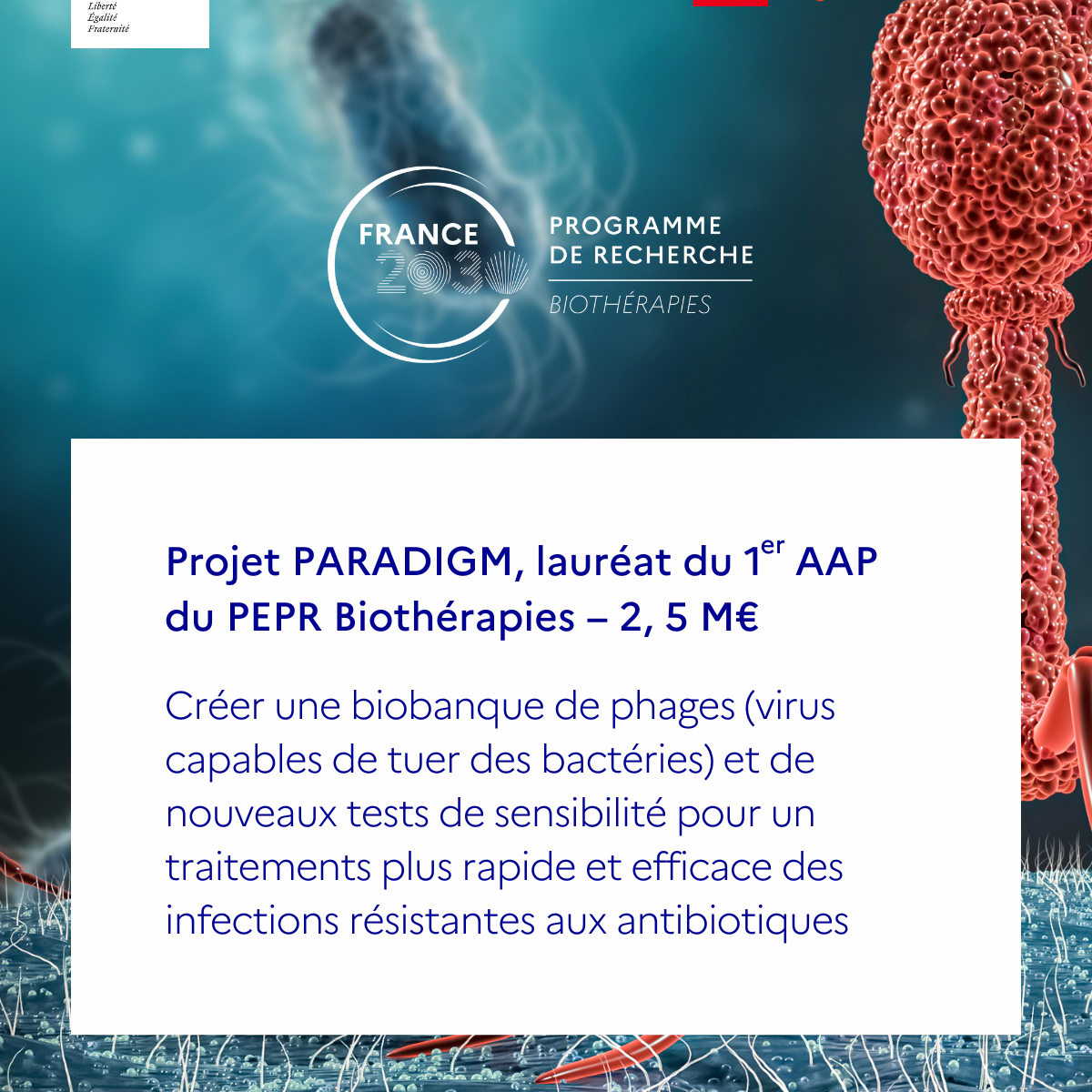 • Projet PARADIGM (2,5 M€) : Création d’une biobanque de phages, virus capables d’éliminer des bactéries pathogènes, associée à des nouveaux tests de sensibilité afin de répondre rapidement aux infections résistantes aux antibiotiques.