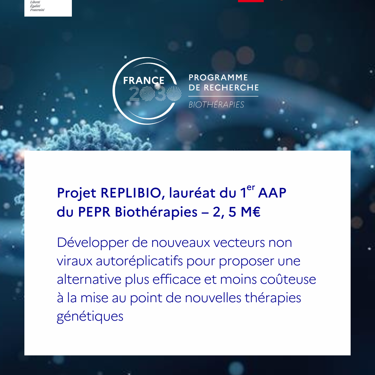 • Projet REPLIBIO (2,5 M€) : Développement de vecteurs autoréplicatifs non viraux en tant qu’alternative plus efficace et économique aux vecteurs actuels, favorisant ainsi la démocratisation des thérapies géniques.